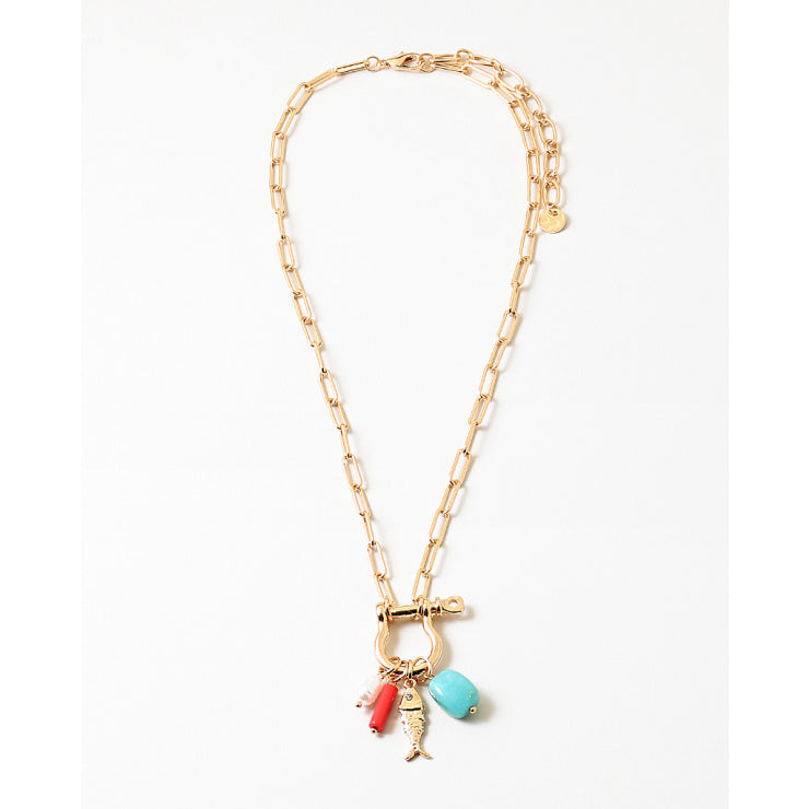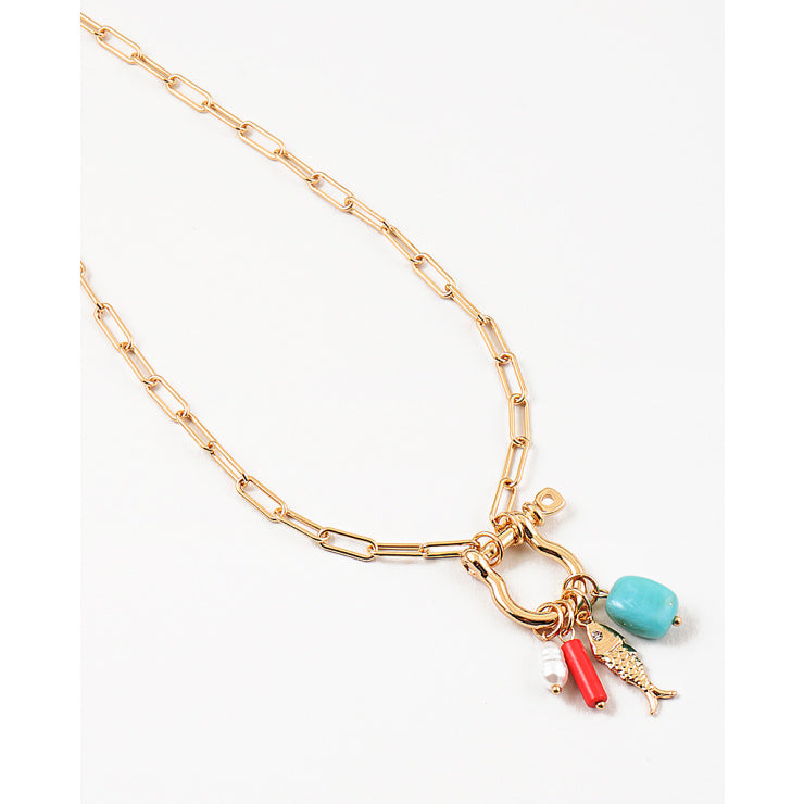 Dive into vacation vibes with this playful sea life charm necklace. Featuring a coastal mix of turquoise, coral tones, delicate pearls, and fish-inspired charms, each detail captures the color and movement of the ocean. Designed to feel light, joyful, and full of summer energy, it’s the perfect piece for sun-soaked days and resort nights.